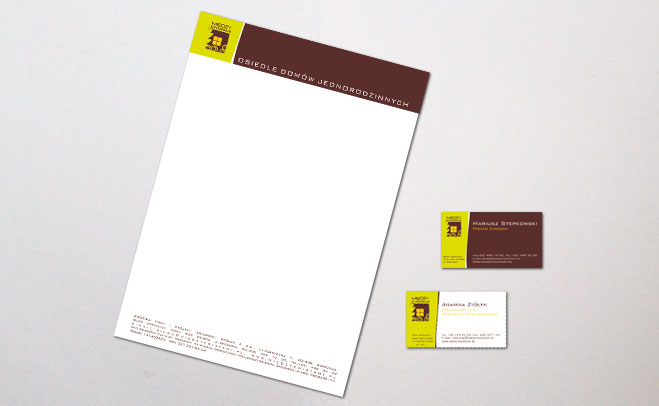 Opis:Papier i wizytówki - wybrane elementy materiałów marketingowych dla osiedla domów "Między Kwiatami" dla Projekt Komorów