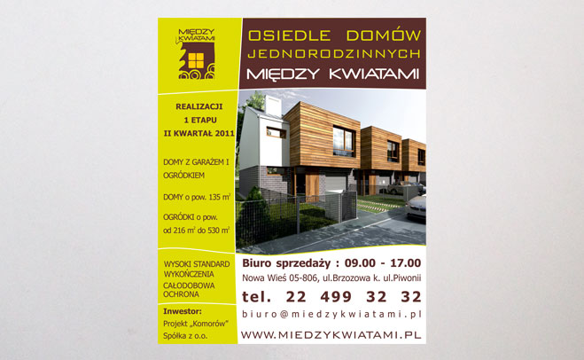 Opis:Ogłoszenie prasowe - wybrane elementy materiałów marketingowych dla osiedla domów "Między Kwiatami" dla Projekt Komorów