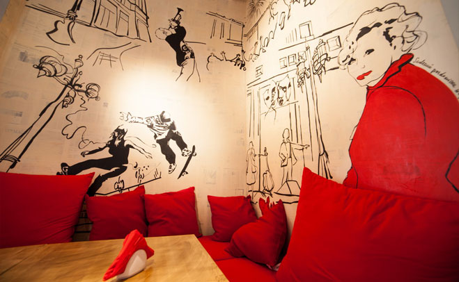 i realizacja wnętrza lokalu gastronomicznego "Konstytucji" na Pl.Konstytucji w Warszawie. Podpis Krystyny Jandy