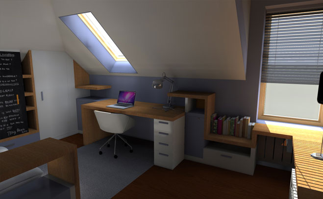 Opis:Projekt pokoju na poddaszu oraz mebli dla chłopca
